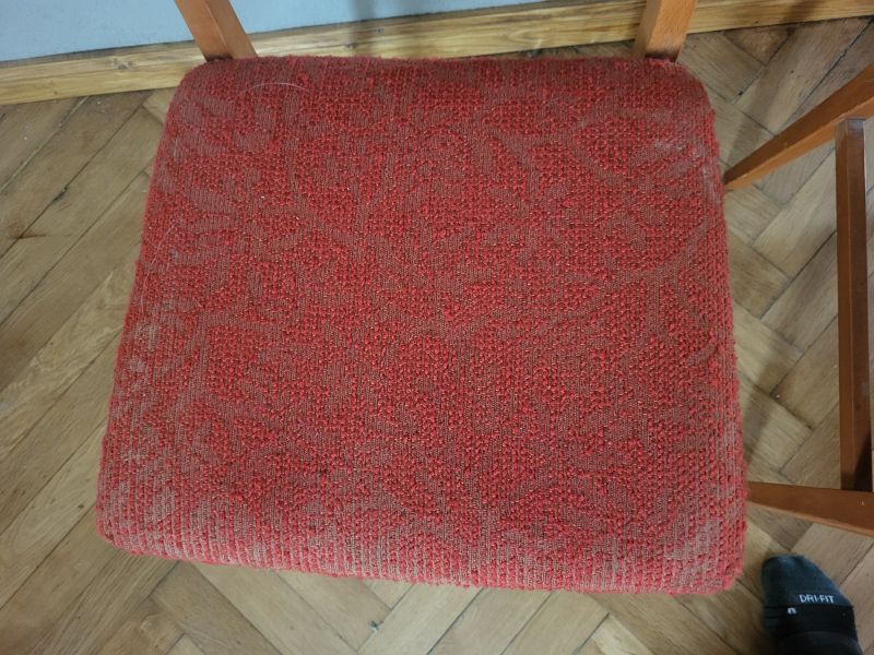 Der rote Bezug ist noch gut erhalten wie auch die Stühle. Alle noch stabil mit normalen Gebrauchsspuren am Holz. Den genauen Zustand bitte den Bildern entnehmen