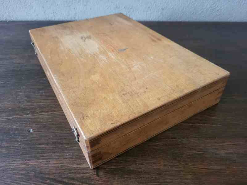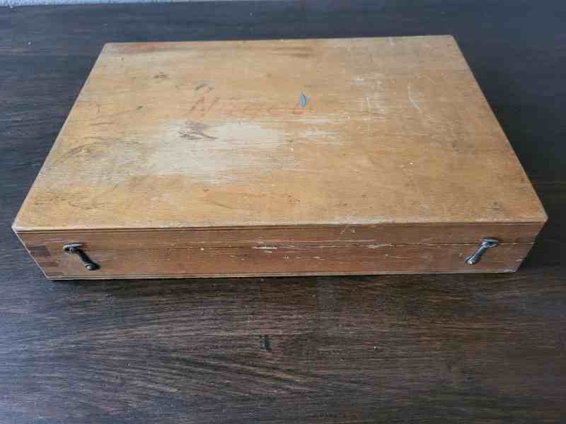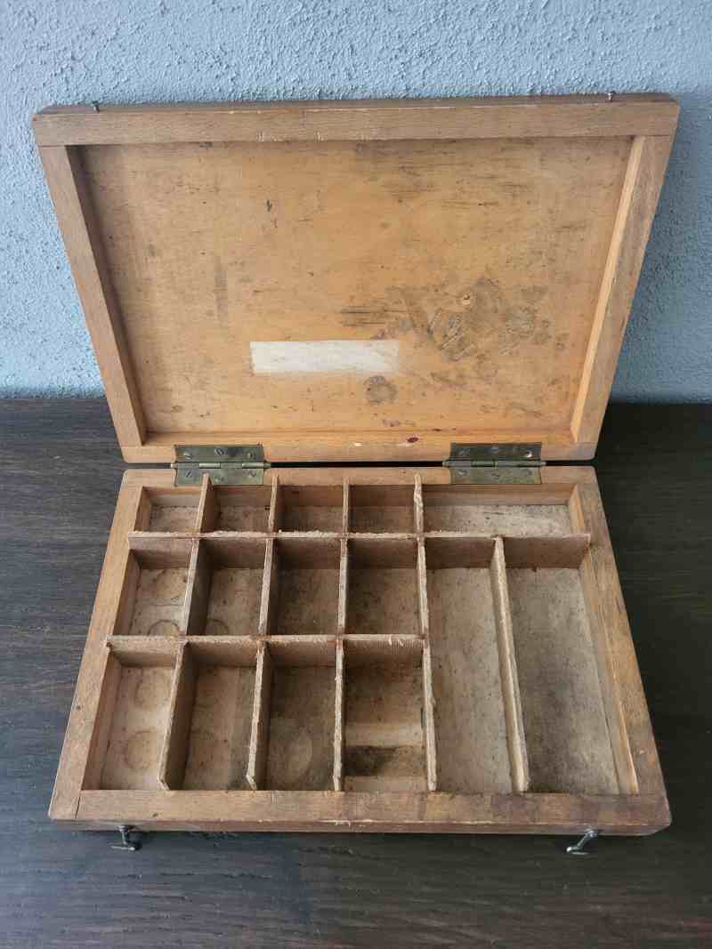 Sie besitzt Gebrauchsspuren und innen würde nachträglich eine Unterteilung reingebastelt. Diese könnte man auch wieder entfernen. Der Deckel geht gut auf und zu, den genauen Zustand bitte den Bildern entnehmen