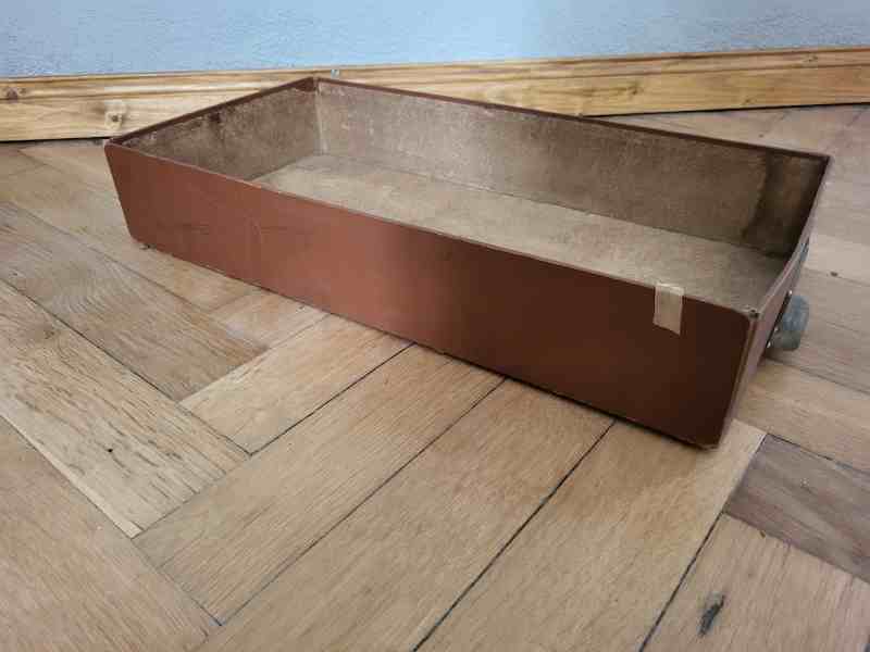 Die Schublade ist recht tief und stammt vermutlich aus einem Büroschrank. Innenboden fleckig, ansonsten noch stabil.