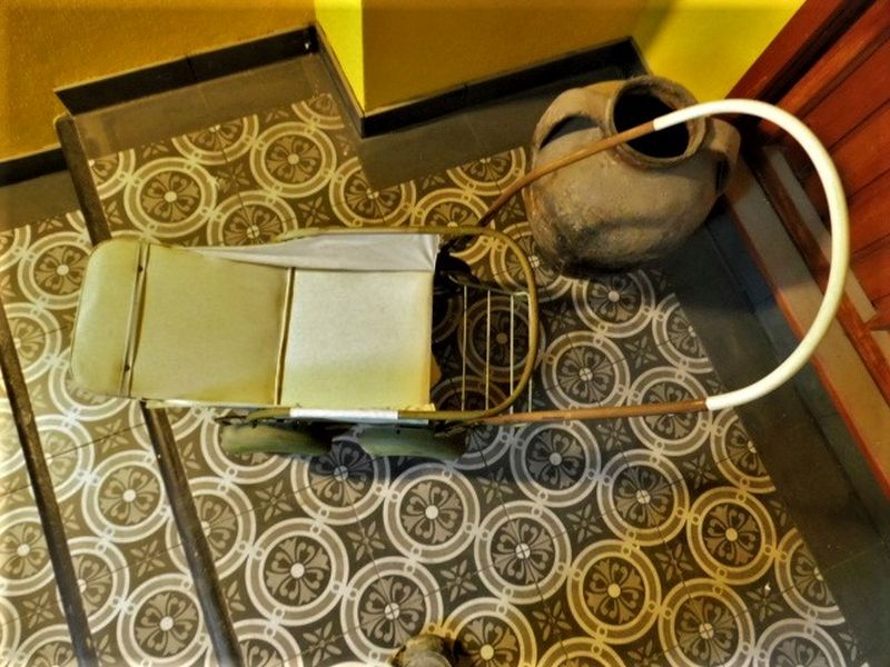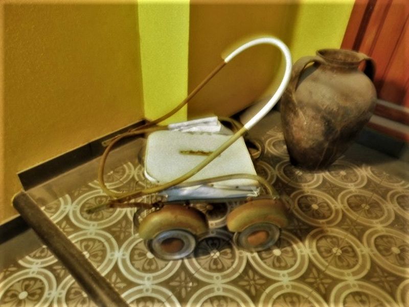 Er besitzt Gebrauchsspuren wie Flugrost an den Metallteilen und die seitlichen Verkleidungen des Bezuges sind teilweise vom Rahmen abgegangen bzw. eben fehlerhaft. Er läßt sich im Bedarfsfall auch noch zusammen klappen. Die Räder drehen sich noch gut.