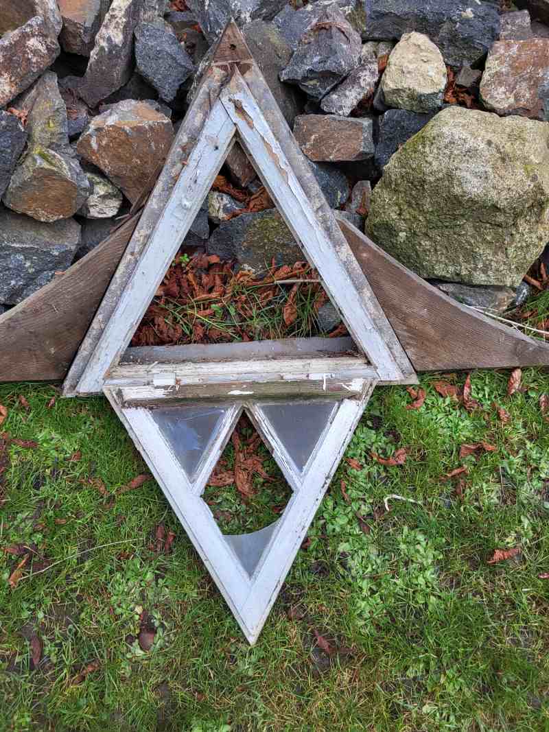 Das Fensterglas ist teilweise beschädigt, insgesamt ist es noch gut erhalten. Man kann es noch gut öffnen und schließen. Links und rechts sind noch die Anbauteile für das Dach befestigt. Diese sind mit Nägeln verbunden, beim Versand werde ich eines abnehmen und dazu legen damit ich das Fenster mit DHL versenden kann, ansonsten wäre es Sperrgut. Sehr selten angeboten in der dreieckigen Form und eine super Dekoration