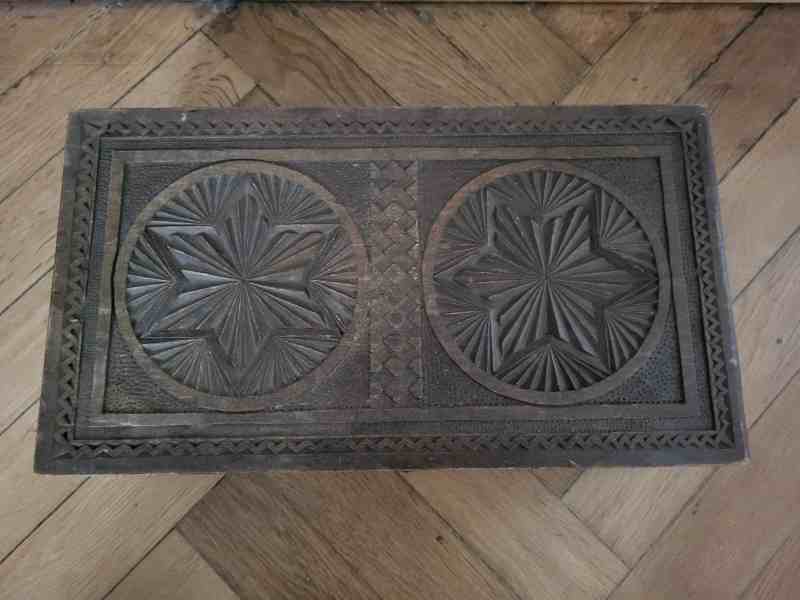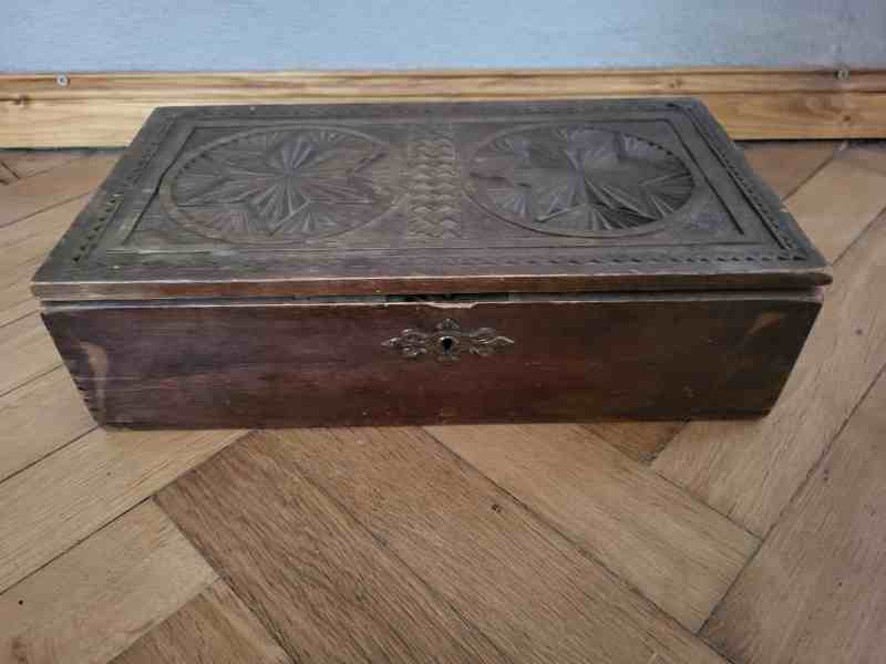 Sie ist verziert mit sehr schönem Motiv. Sehr aussergewöhnlich und wirklich dekorativ. Schlüssel ist keiner mehr vorhanden. Innen ist sie auch gut erhalten. Hinten sind die Scharniere mal repariert worden, der Deckel geht gut auf und zu, den genauen Zustand bitte den Bildern entnehmen