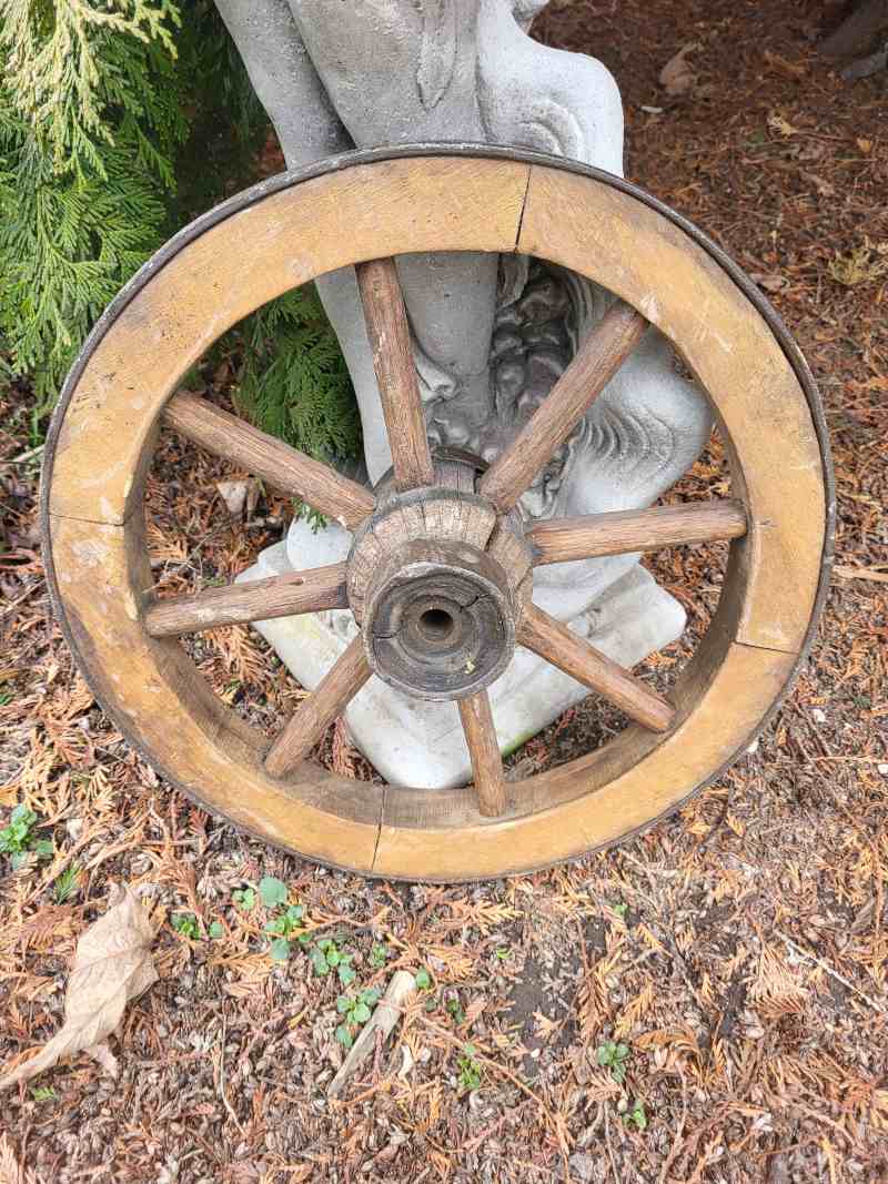 altes Schubkarrenrad, Wagenrad, Holzrad, Rad, mit Nabe, Speichenrad. Karrenrad