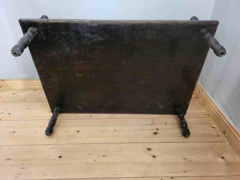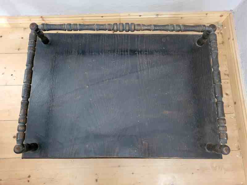 Sie stammt um 1900 und vorne wurde der Stab irgendwann einmal entfernt. Auch an den Ecken wurde etwas mal abgesägt. Wofür dieses alte Teil mal genutzt wurde ist mir leider nicht bekannt. Ideal zur Dekoration, kein Wurmbefall und mit normalen Gebrauchsspuren. Den genauen Zustand bitte den Bildern entnehmen