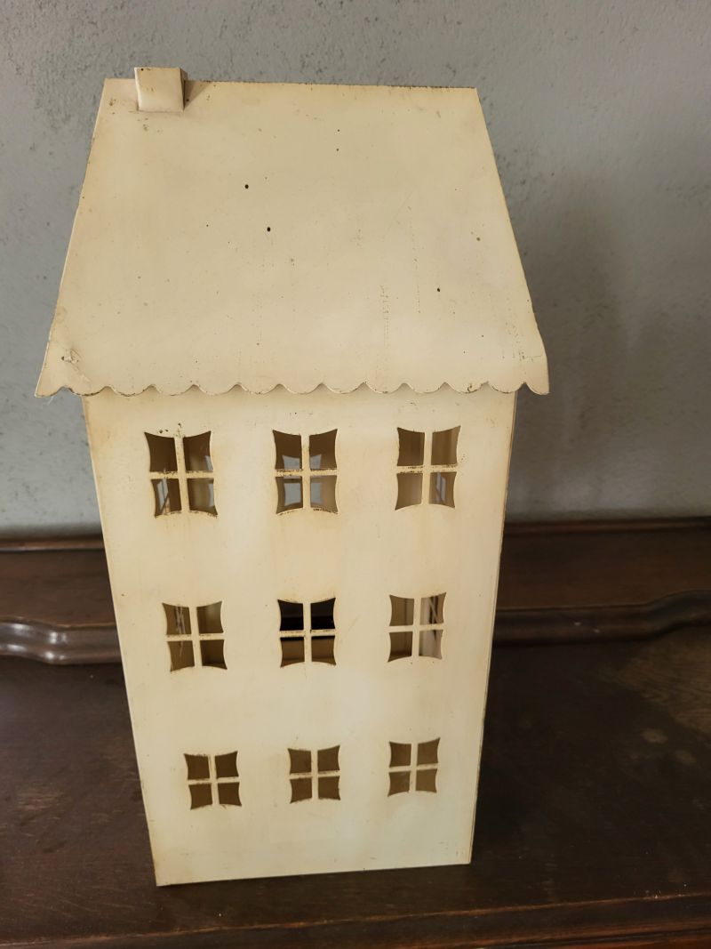 Angeboten wird aus Metall ein Haus worin man eine Kerze zur Beleuchtung stellen kann.