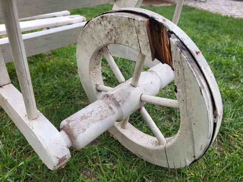 Leider stand sie einige Jahre schon im Garten und besitzt entsprechende Gebrauchsspuren. Hauptsächlich das Rad ist schon sehr mitgenommen und nicht mehr komplett. Den genauen Zustand bitte den Bildern entnehmen