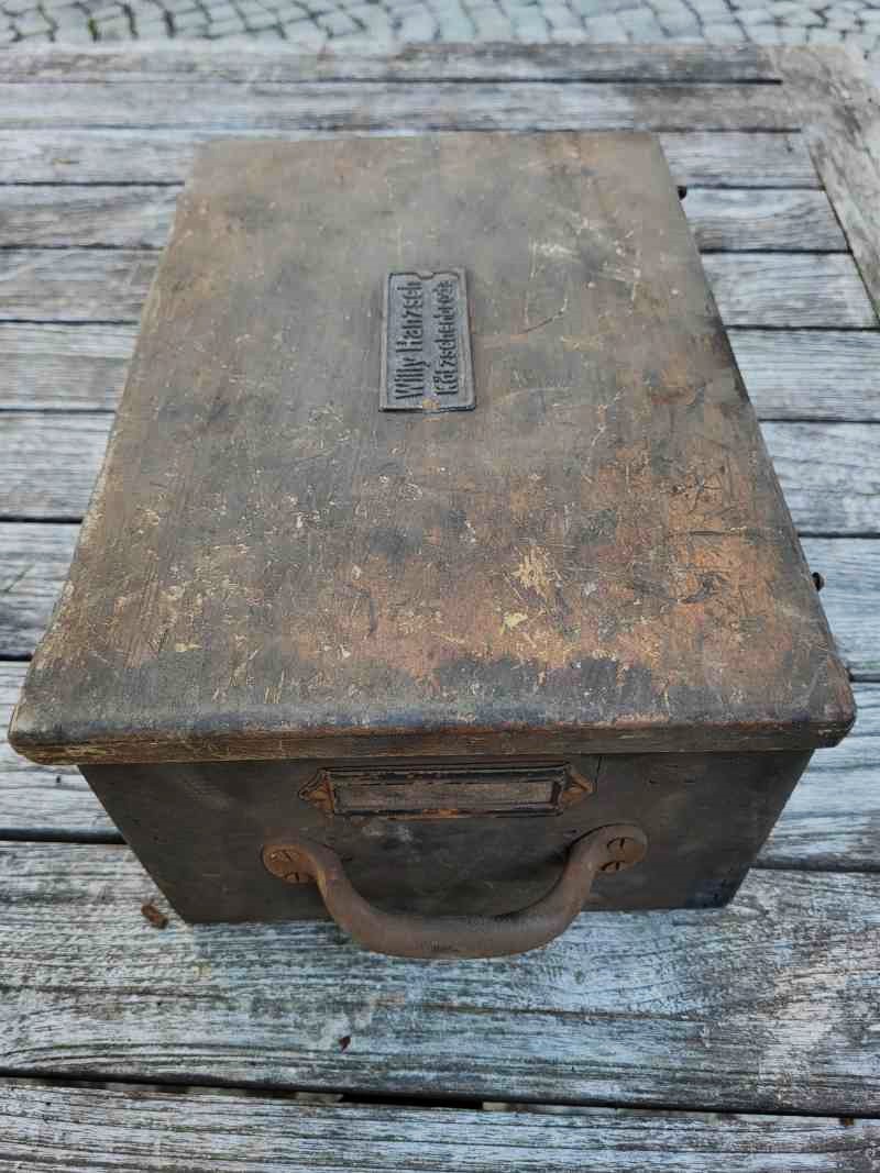 Sie besitzt normale Gebrauchsspuren, ist aber noch gut erhalten und stabil. Großer Eisengriff und Hersteller auf dem Deckel. Den genauen Zustand bitte den Bildern entnehmen.