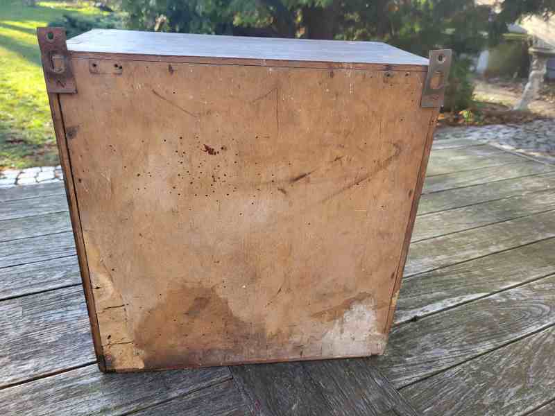 Er besitzt normale Gebrauchsspuren, die Tür geht gut auf und zu. In der Rückwand sind Wurmlöcher. Am einfachen ist es diese einfach auszutauschen dann hat man einen kleinen praktischen Hängeschrank.